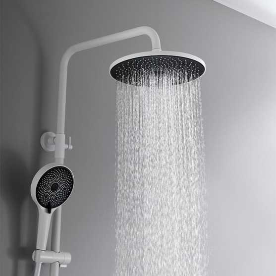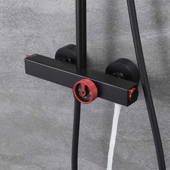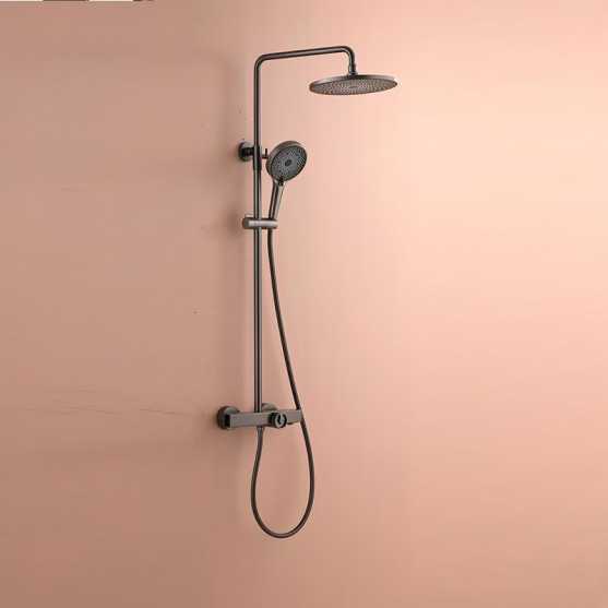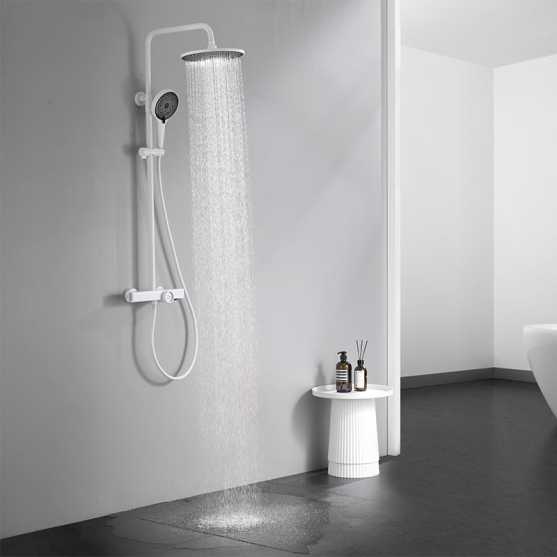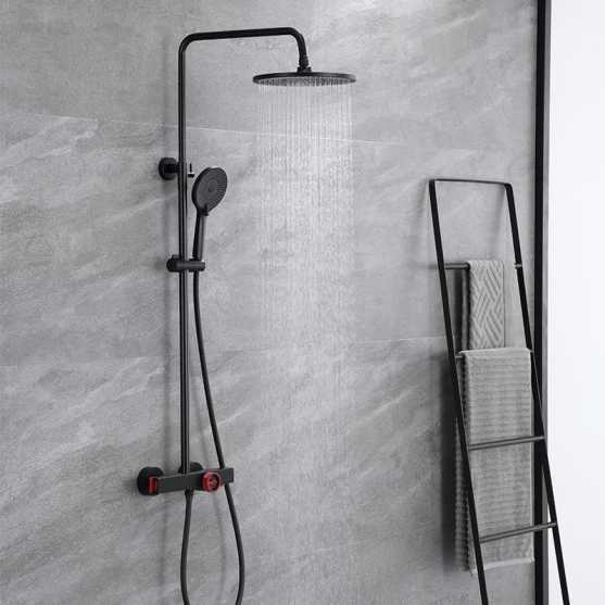 Exposed bathroom rainfall shower system. Thermostatic shower set with 3 modes handheld shower.